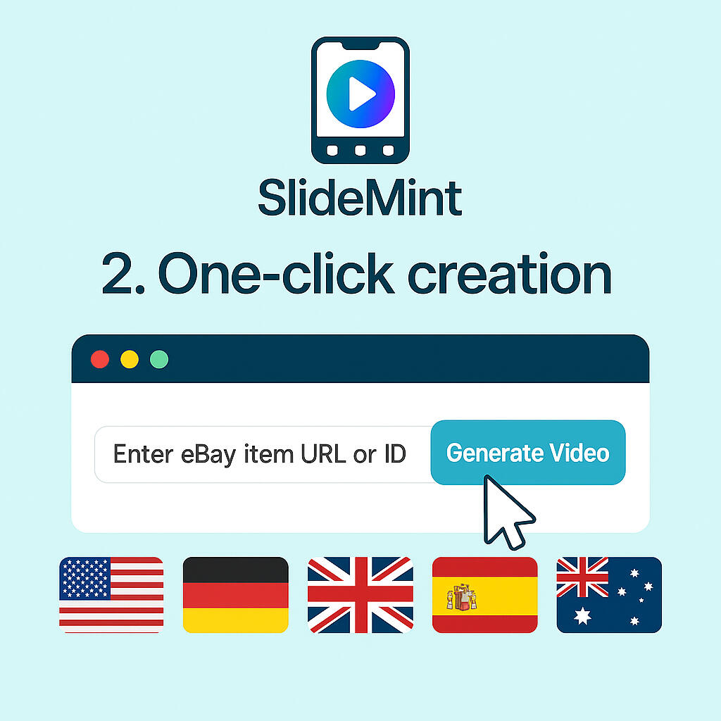 Paste your eBay URL. SlideMint pulls your images and builds a clean, platform-ready MP4 slideshow plus an image pack in seconds. Everything is sized correctly for eBay and socials—no pixelation, no compression surprises. 1 credit = 1 ready-to-share pack.